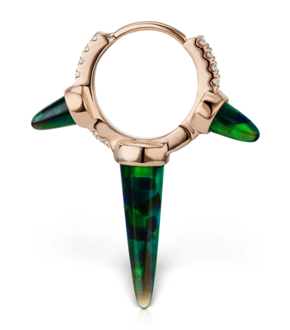 MARIA TASH has been making waves on the jewellery scene for decades with its fusion of nickel-free and hypoallergenic materials, precious gems and a love of bespoke body piercing. Capturing the New York brand’s haute rock ‘n’ roll identity, this iteration of the easy-to-wear clicker ring – aptly named the Triple Long Spike Diamond Eternity earring – is crafted in warm 18-karat gold and adorned with iridescent, lab-grown black opal spikes to lend a darkly mysterious finish.