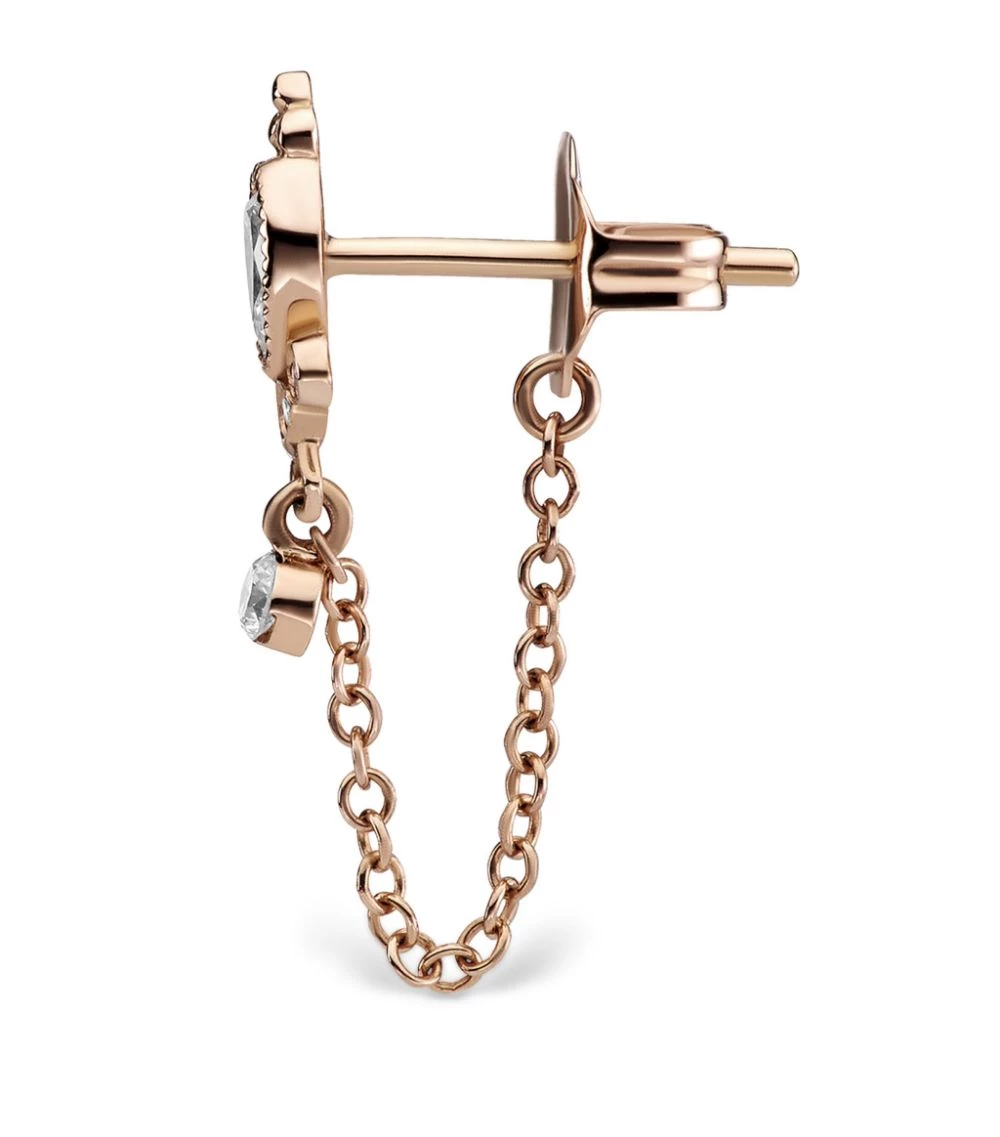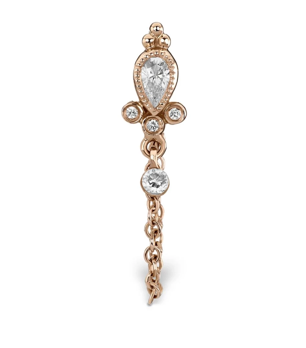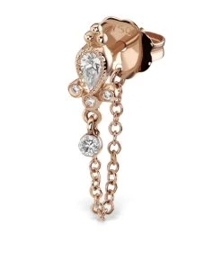 Inspired by the intricate and ineffably feminine designs of India and Pakistan, this delicate earring from New York jeweller MARIA TASH is hand-cast in gleaming 18-karat rose gold. Encrusted with a quartet of round diamonds and a marquise diamond to the centre, a chain dangles down to create a contemporary lobe-wrapping effect.