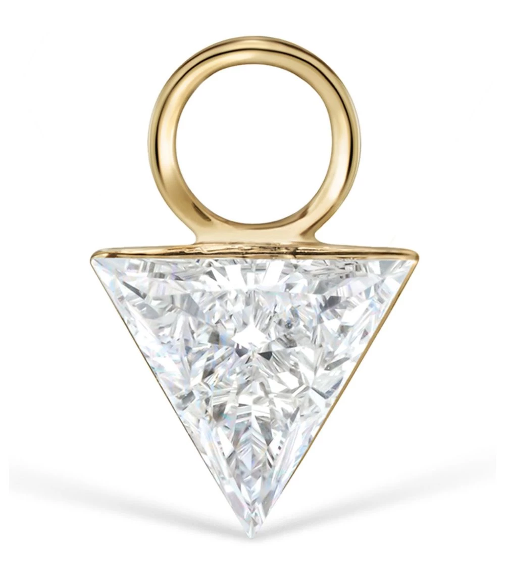 The beauty of this MARIA TASH ear charm lies in its invisible setting – a technique that presents the diamond as if floating effortlessly and ephemerally upon your curated ear. Both the setting and the contemporary triangular shape of the gemstone are a testament to the pioneering vision of the jeweller, demonstrating her ability to reimagine piercings for a new generation.