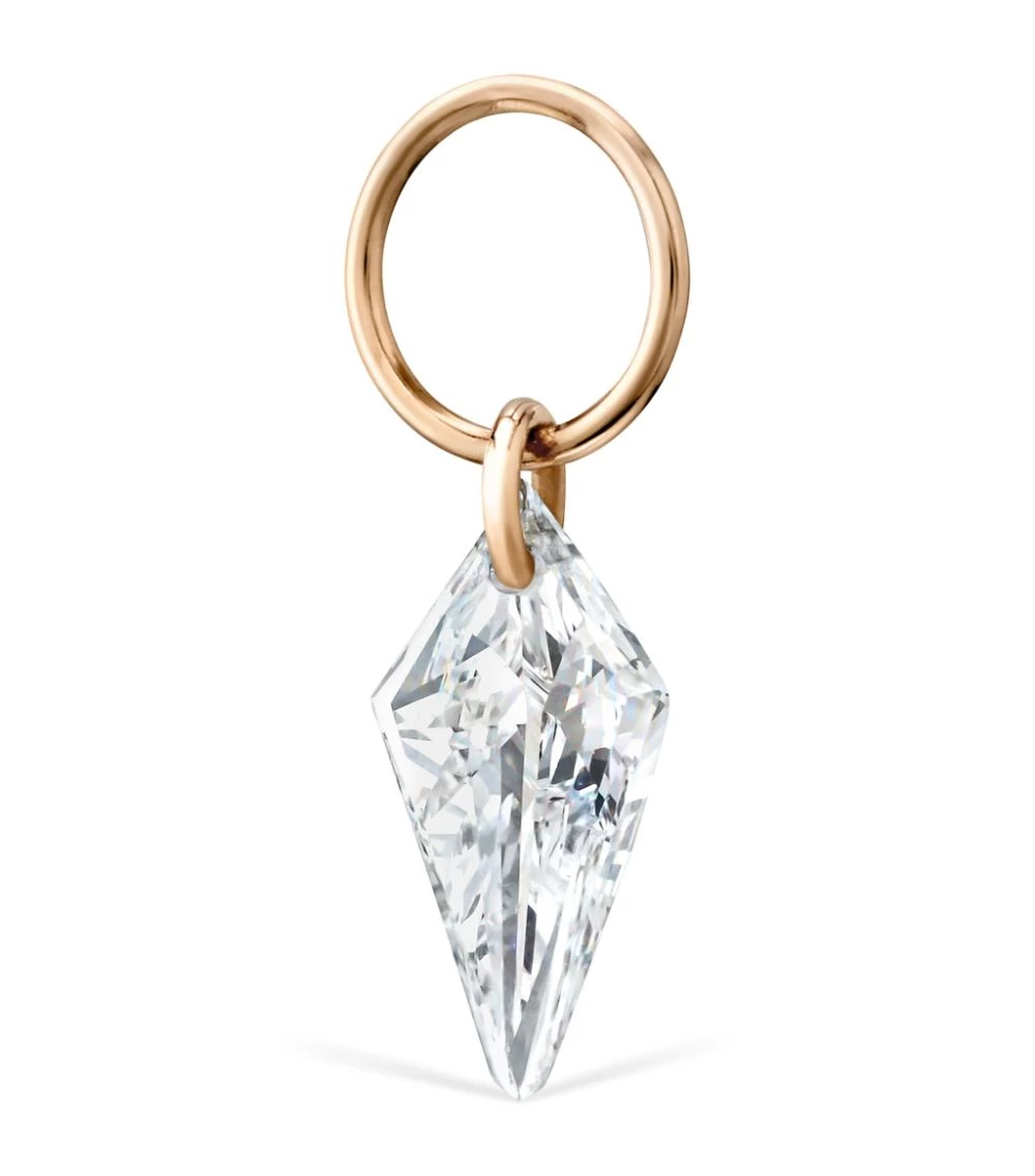 Behold truly uninterrupted sparkle with MARIA TASH’s small Silhouette charm, featuring an exclusively faceted diamond that is liberated of any metal setting. Its spiked profile balances edge with elegance, and it hangs from an 18-karat rose gold hoop to allow free, flickering movement when attached to your earring of choice.