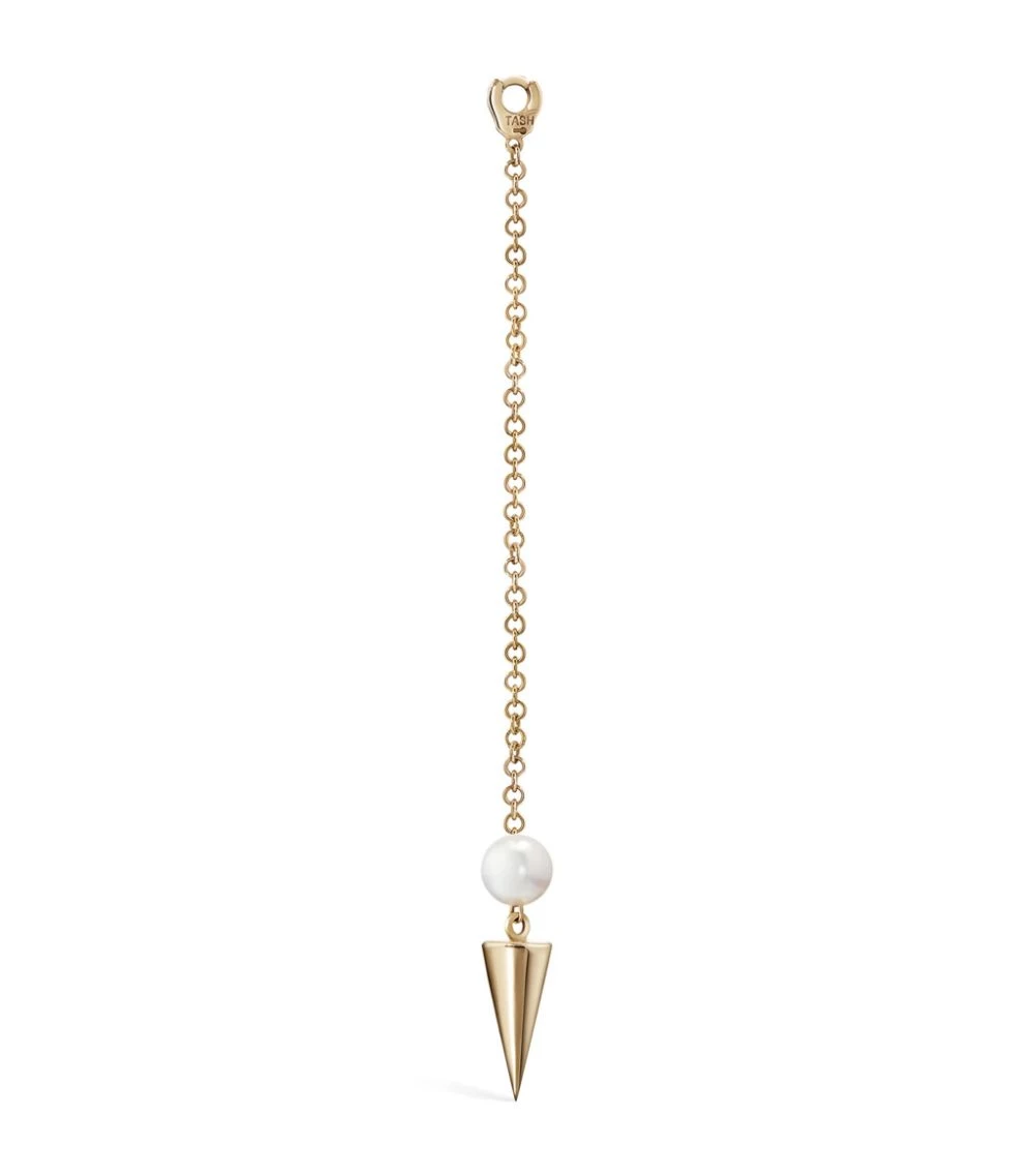 It’s hard not to be compelled by this MARIA TASH earring charm. Rendered in nickel-free and hypoallergenic yellow gold, the design sees a spike and its lustrous pearl suspended from a long chain– a visual motif that’s as enigmatic as it is youthful and rebellious. Pair it with your usual studs and watch as the swinging pendulum brings new life to your signature stack.