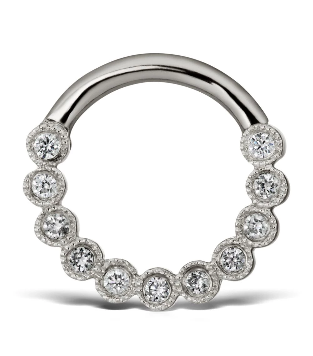 Hailing from New York’s East Village, MARIA TASH has become world-renowned for its dainty yet subversive jewellery like this single horizontal clicker ring. Set in white gold scalloped bezels to give them the appearance of being encircled by an intricate braid, its cubic zirconias add a hint of sparkle to septum and daith piercings.