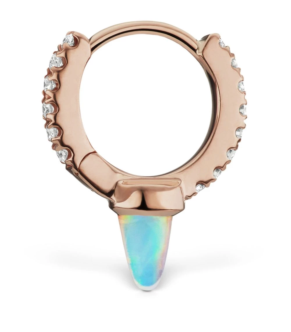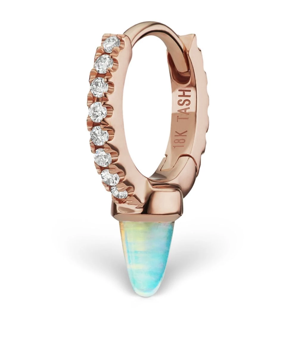 MARIA TASH has been making waves on the jewellery scene for decades with her fusion of fine materials, precious gems and a love of bespoke body piercing. Capturing the label’s haute rock ‘n’ roll identity, this iteration of the easy-to-wear clicker rings is crafted in gleaming 18-karat rose gold, deep-set with diamonds and finished with an iridescent lab-grown opal spike reminiscent of an icicle.