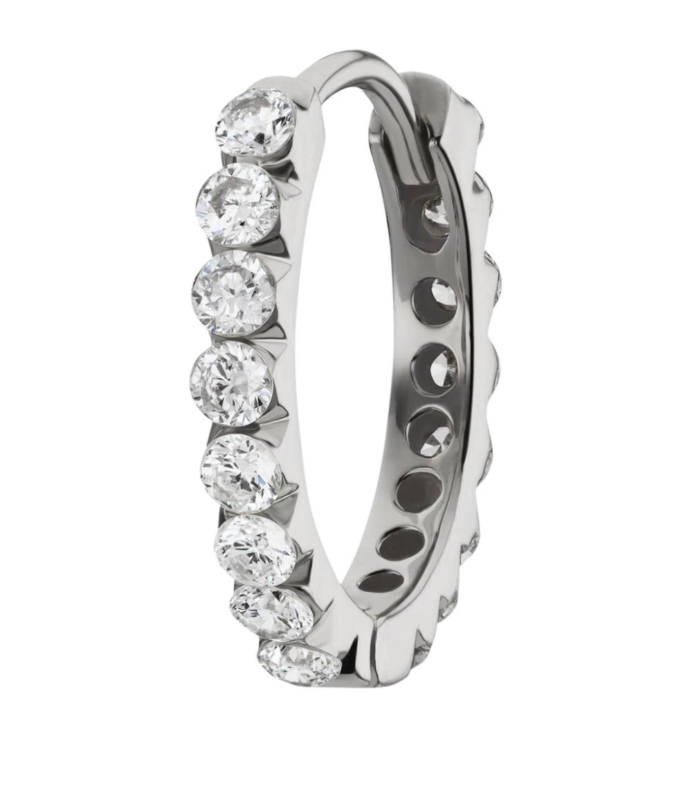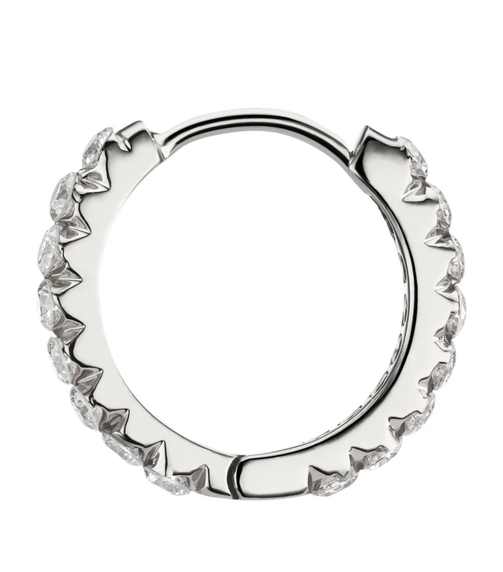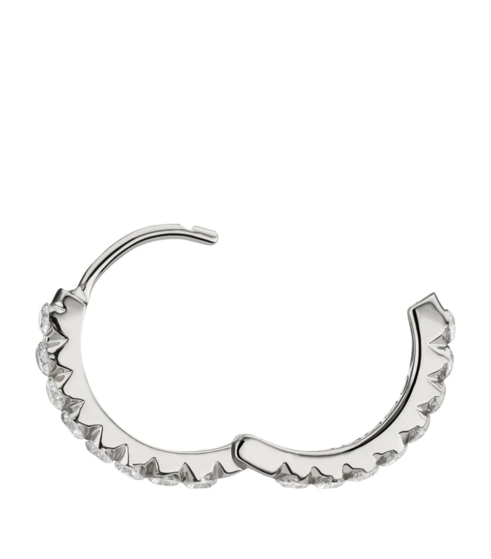 Building her brand around fine body jewellery, MARIA TASH has revolutionised the piercing industry thanks to her luxurious approach to precious metals and stones. A far cry from industrial steel and heavy posts, the designer has since expanded into much more than simply earrings. Inspired by Indian and Pakistani styles, this delicate earring from the Diamond Eternity collection is characterised by its minimalist clicker design and is crafted from nickel-free, hypoallergenic 18-karat white gold, sprinkled with large white diamonds.