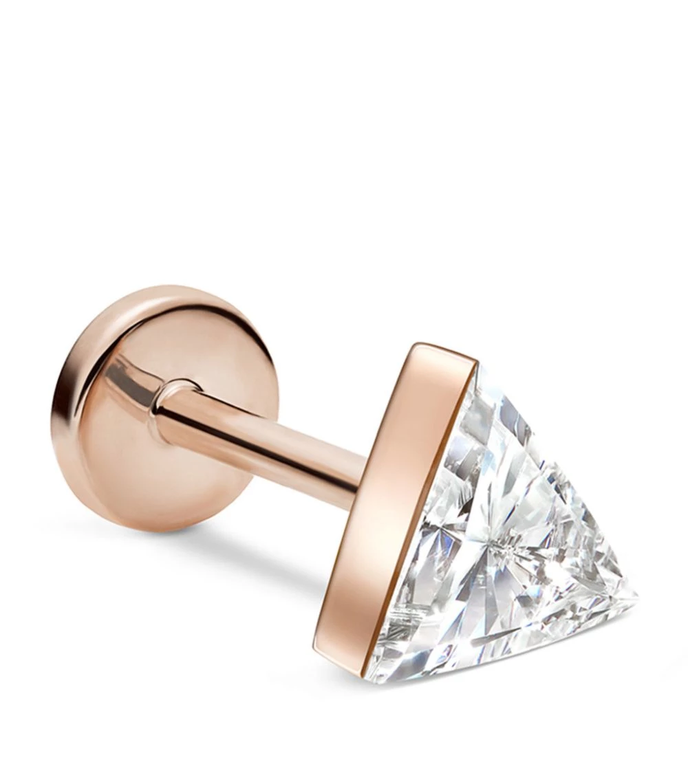 Jewellery designer MARIA TASH is renowned for ornamenting the ear with precious stones that appear as if floating, achieved through exquisitely crafted pieces that sit flush with the skin – much like the Invisible Set Diamond Threaded Stud Earring. A modern take on the original circular design, a single triangle-shaped diamond is offset with a backdrop of nickel-free, hypoallergenic 18-karat rose gold for a luxurious finishing touch.<br /><br /><em></em>