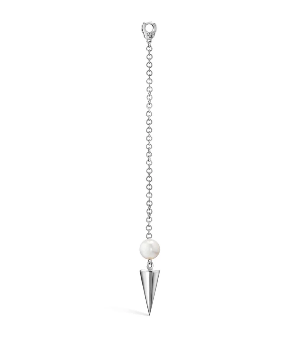 It’s hard not to be compelled by this MARIA TASH earring charm. Rendered in nickel-free and hypoallergenic white gold, the design sees a spike and its lustrous pearl suspended from a long chain – a visual motif that’s as enigmatic as it is youthful and rebellious. Pair it with your usual studs and watch as the swinging pendulum brings new life to your signature stack.