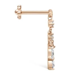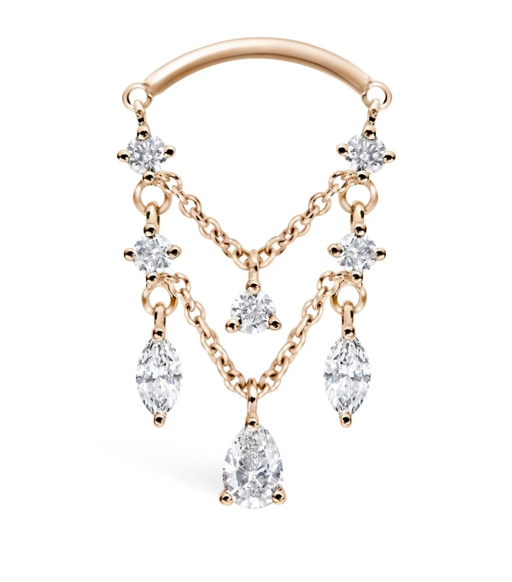 With a gift for design, MARIA TASH brings new life and meaning to your jewellery collection with distinct pieces such as the Diamond Drape Chandelier singlestud earring. A pioneer in the concept of the curated ear – a mode that champions embellishment-heavy looks with multiple piercings – the New York-based jeweller lends extra movement to your unique combinations by mimicking the structure of the extravagant ceiling decoration. Round, marquise and pear-shaped diamonds are here connected by thin yet sturdy, nickel-free and hypoallergenic chains for a layered finish reminiscent of a cascade of sparkles, with the curved bar neatly concealed into the fold of the ear.