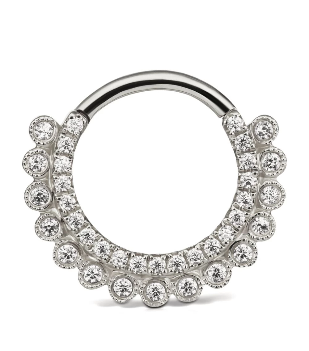 A bestselling design from the piercings specialist that showcases her Eastern influences, MARIA TASH’s dazzling Apsara style updates the signature clicker ring with twin rows of cubic zirconias that grow in size from the inside out. This style is made especially for septum and daith piercings and harbours the twinkling gems in the label’s invisible setting to lend the appearance that they are floating unsupported.