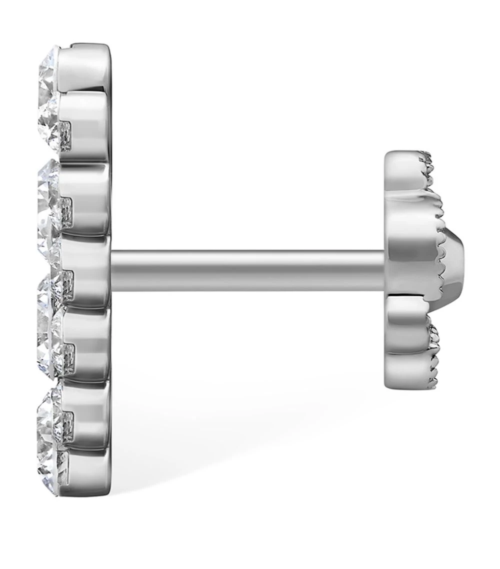 MARIA TASH speaks to the rebels of the jewellery world, conceptualising unique pieces to be worn in all manner of piercings, each elevated by her use of premium materials and expert crafting. The threaded stud is a coveted signature that’s seen many iterations, but perhaps none as powerfully linear as the Apsara Bar single earring which hosts a column of white twinkling diamonds alongside five larger ones in the label’s Invisible set, backed by fine nickel-free and hypoallergenic 18-karat white gold.