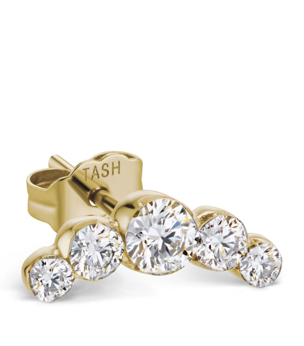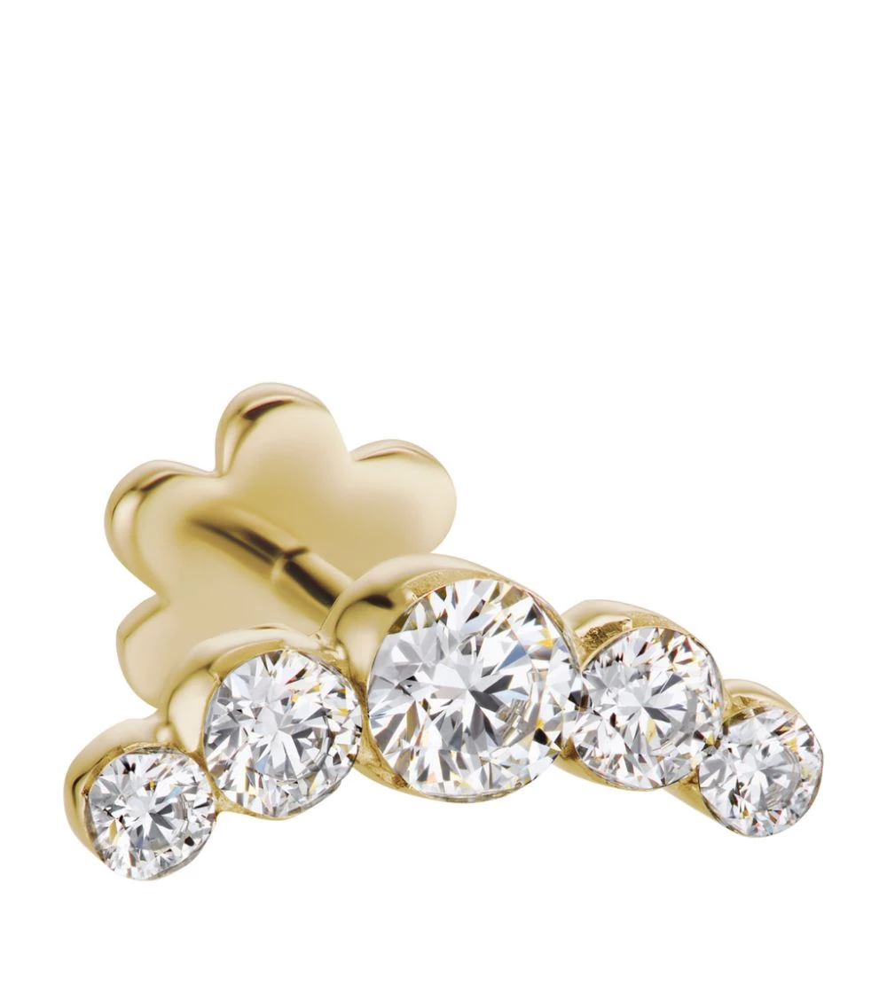 hypoallergenicmaterials, precious gems and expert crafting. Reminiscent of a bespoke pea pod, this threaded stud features five circles harbouring diamonds in the label’s signature invisible setting which gives the appearance that they are floating above the skin.