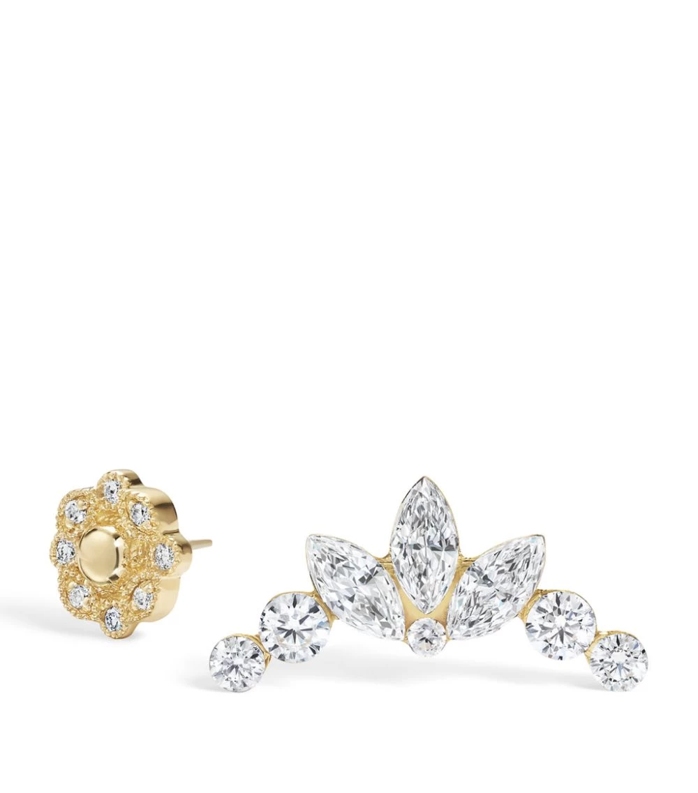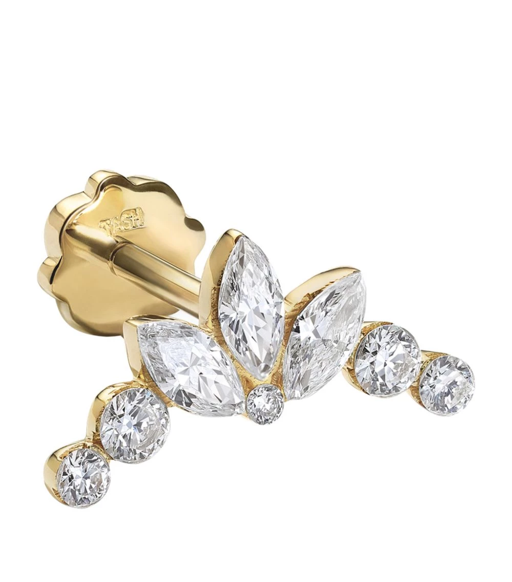 Characterised by MARIA TASH’s signature diamond floral formation, this studded yellow gold earring is a vision of decadence. To each side of the lotus, two smaller diamonds round the accessory slightly for a garland finish – wear it alone or as the centrepiece of a curated edit to add sparkle to your lobe.