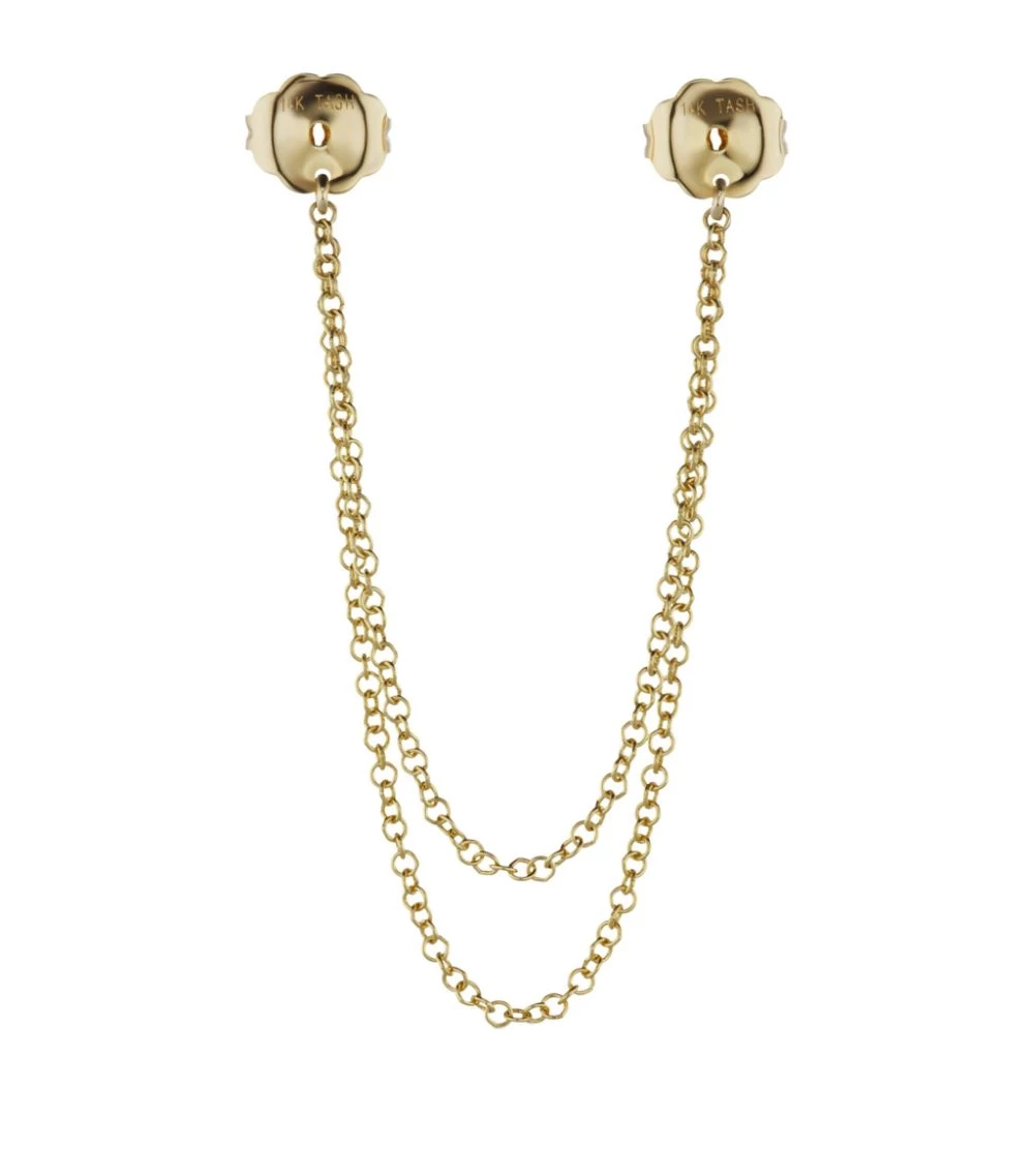 Embrace the subversive New York aesthetic of the East-Village-grown label with these two-chain double earring backs. They suspend a pair of delicate yellow gold, nickel-free and hypoallergenicchains between two earring backs, lending an extra cohesive dimension to your favourite pair of MARIA TASH studs.