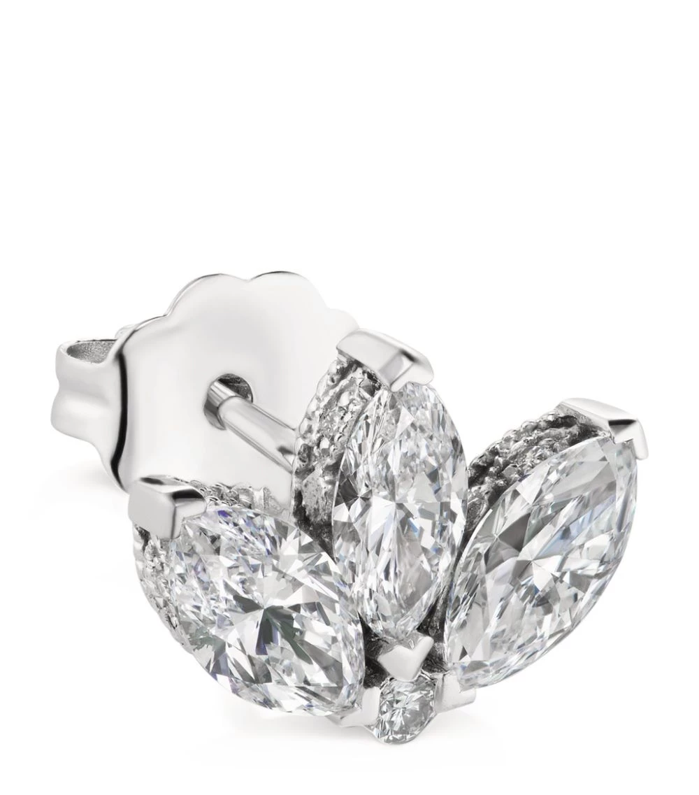 A jewellery brand renowned for its floating gemstones crafted upon barely-there settings, MARIA TASH displays its eye for pristinely cut designs with meaning through the Engraved Diamond Lotus collection. Imagined in gleaming 18-karat white gold that’s both nickel free and hypoallergenic, this single stud earring sees three luminous marquise diamonds fan out to form the petals of a symbolic flower, creating the perfect foundation for an array of the label’s carefully curated ear pieces.