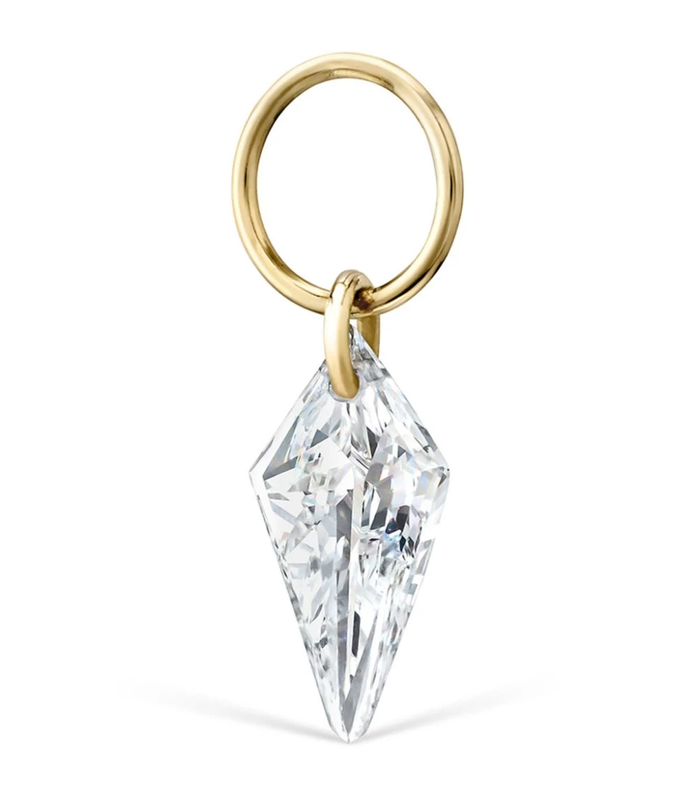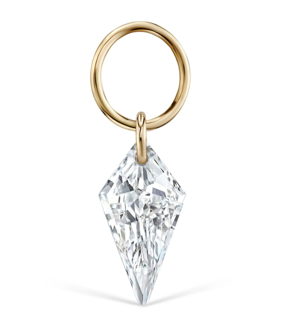 Behold truly uninterrupted sparkle with MARIA TASH’s small Silhouette charm, featuring an exclusively faceted diamond that is liberated of any metal setting. Its spiked profile balances edge with elegance, and it hangs from an 18-karat yellow gold hoop to allow free, flickering movement when attached to your earring of choice.