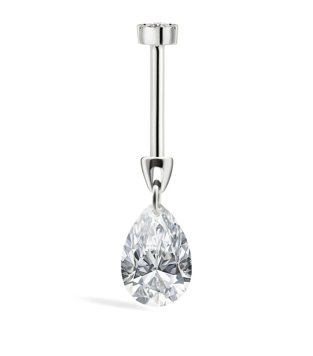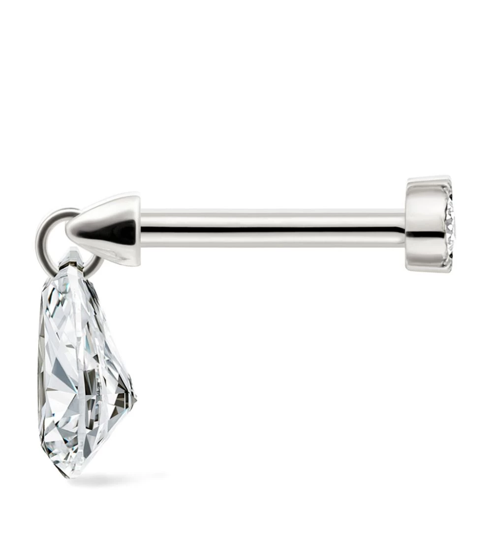 In the world of MARIA TASH, diamonds defy gravity; the white gold Floating Pear Charm threaded stud single earring is the perfect example of this, showcasing just how the jewellery designer manages to create this sought-after illusion. Some would say magic, others would say it’s a discrete jump ring mechanism that grants the stone subtle movement, allowing it to catch the light and showcase the diamond’s brilliant pear shape.