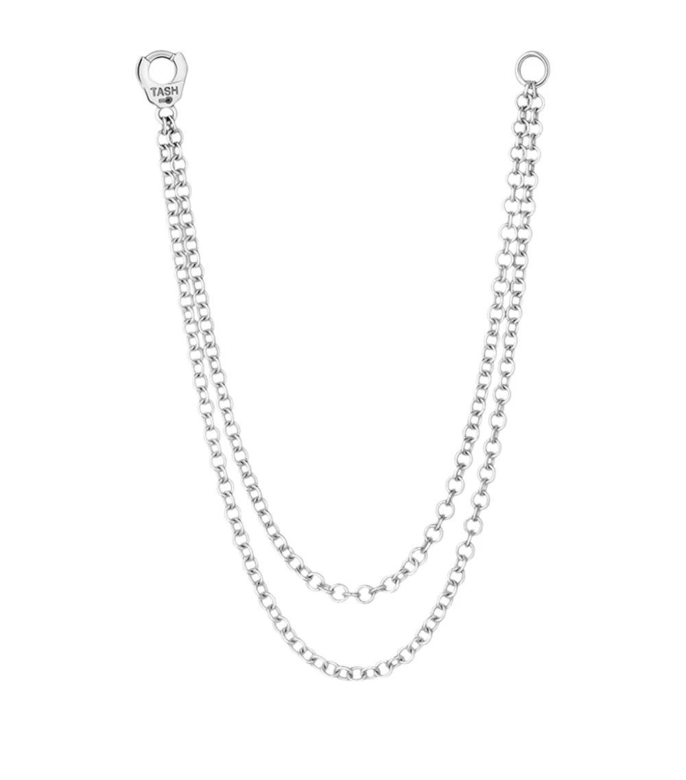 Embrace the subversive New York aesthetic of East Village-based label MARIA TASH with this double-layer chain charm – nickel-free and hypoallergenic . Delicate white gold chains suspend between two clasps, lending an extra cohesive dimension to your favourite pair of MARIA TASH studs.