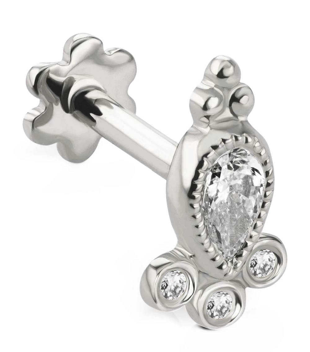 Inspired by the intricate and ineffably feminine designs of India and Pakistan, this delicate MARIA TASH earring sees a scalloped-set pear diamond skirted with a trinity of silver balls above and a trio of diamonds below. Cast within nickel-free and hypoallergenic 18-karat white gold, the dazzling stud makes for an elegant finishing touch to a myriad of looks.