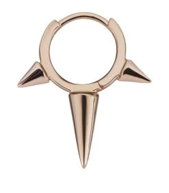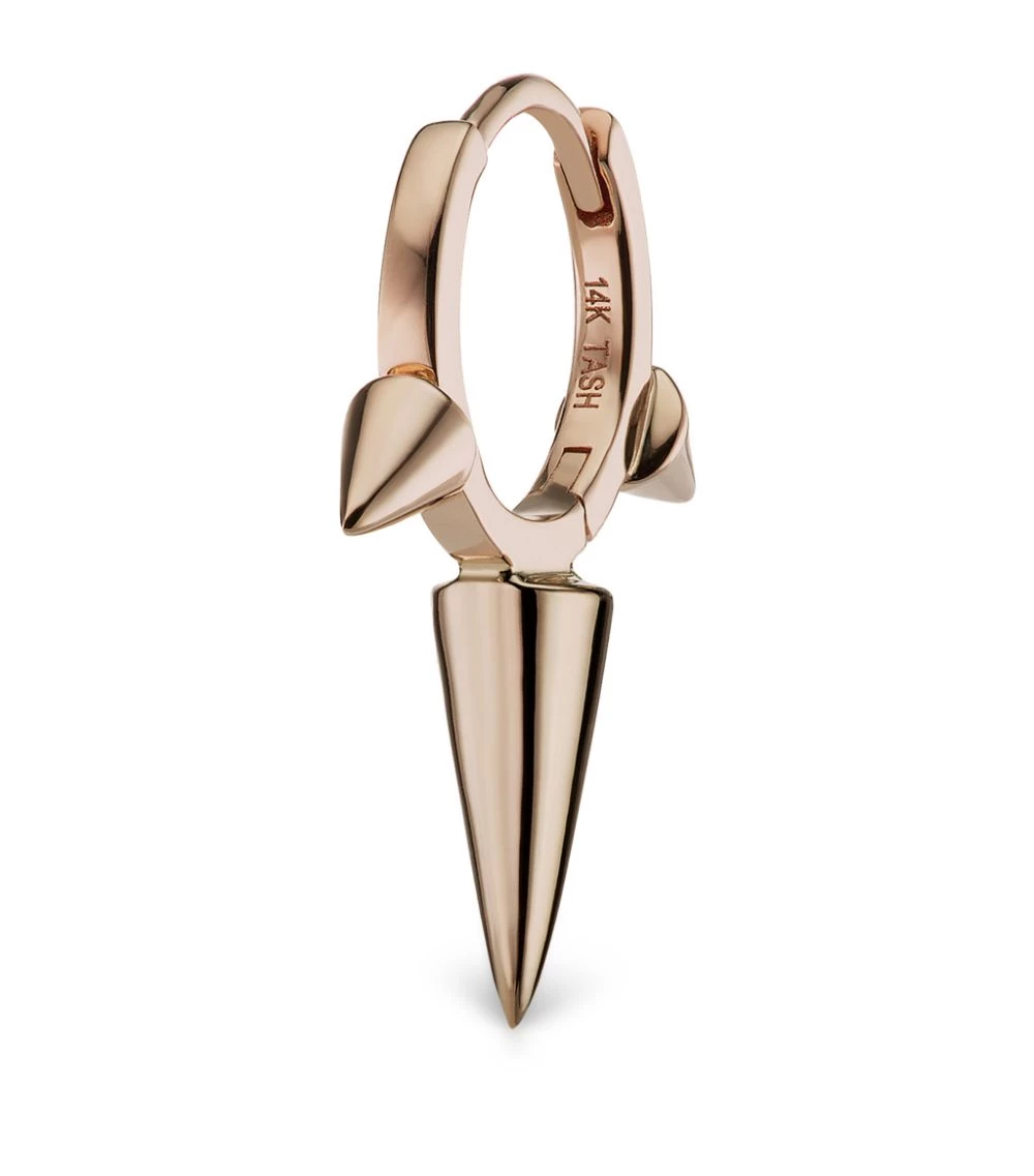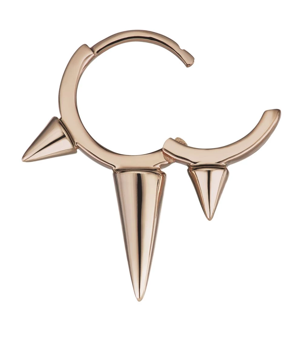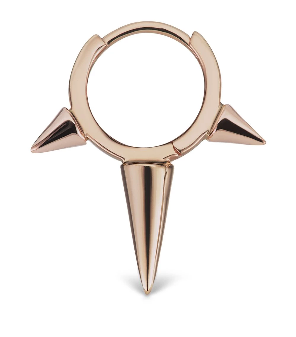 Professional piercer and coveted jewellery label MARIA TASH expands on her sought-after selection of dainty earrings and fine jewellery with the Spike collection: a grunge-meets-luxe approach to everyday adornments. Crafted from nickel-free and hypoallergenic 14-karat rose gold with a trio of spikes in varying lengths, this high-shine single hoop earring fastens innovatively with a hinge closure to the top – a unique design feature invented by Maria herself.