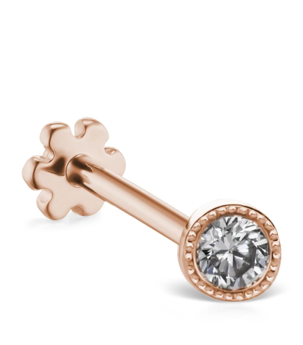 MARIA TASH speaks to the rebels of the jewellery world, conceptualising unique pieces to be worn in all manner of piercings, each elevated by her use of fine materials, precious gems and expert crafting. Quietly understated, this threaded stud is realised in warm rose gold and harbours a scintillating central diamond surrounded by a hammered border for a contemporary touch.