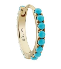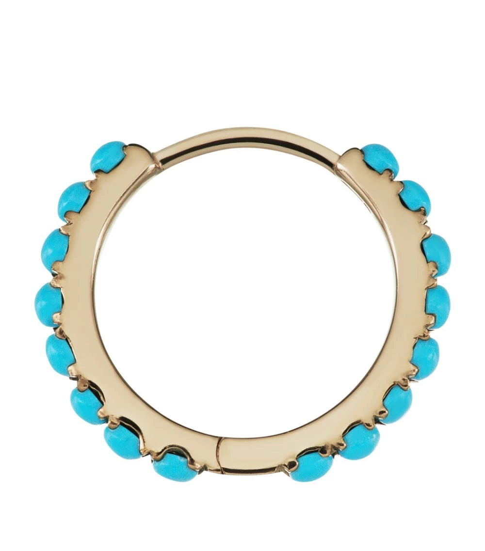 Building her brand around fine body jewellery, MARIA TASH has revolutionised the piercing industry thanks to her hedonistic approach to metals and stones. Inspired by Indian and Pakistani styles, this delicate single earring from the coveted Eternity collection is crafted from nickel-free and hypoallergenic 14-karat yellow gold and inlaid with 16 natural turquoise stones. Characterised by its signature clicker fastening, style with other pieces from the edit for a unique display of luxury.
